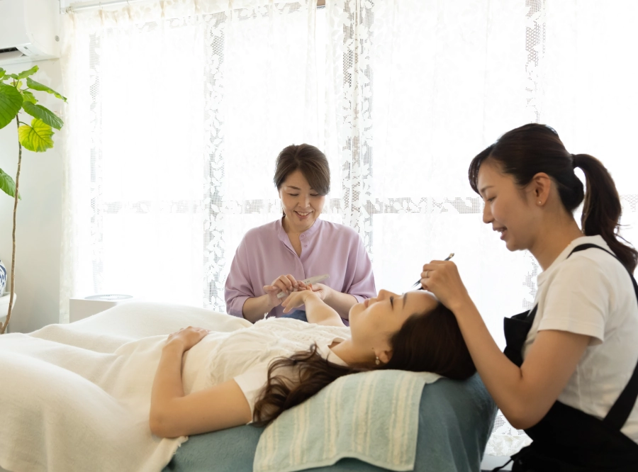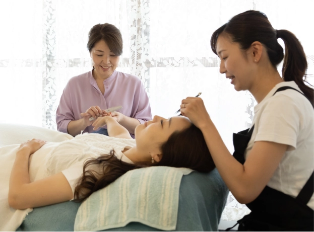 専門学校とは異なり、実際の施術の流れや接客を経験することができるので、サロンで求められる動き方や考え方が自然と身につき、卒業後は年齢問わず、堂々と即戦力として現場デビューできます。