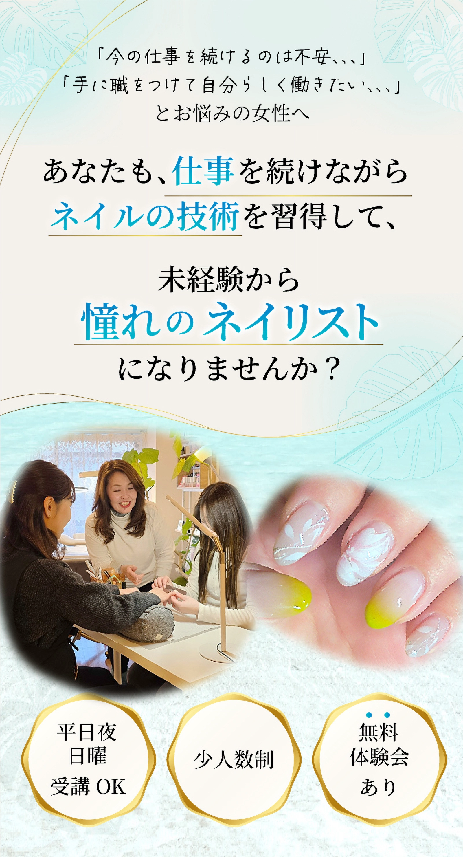 落ち着いた大人の感性・丁寧さ・コミュニケーション力は、むしろネイリストとして強みになります。あなたのペースに合わせ、技術も基礎から徹底してサポートしますので、ご安心ください。