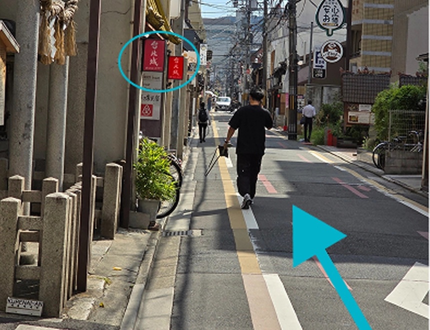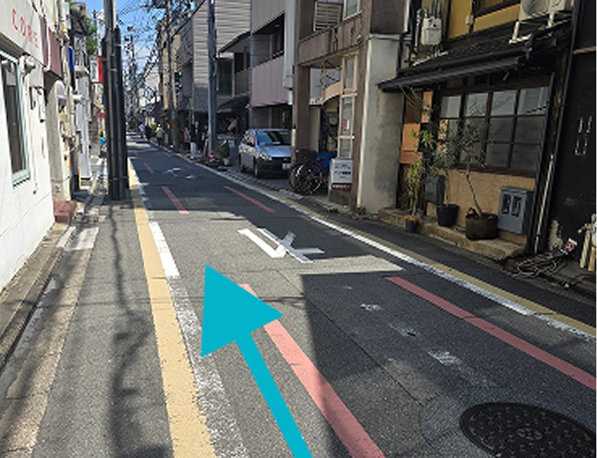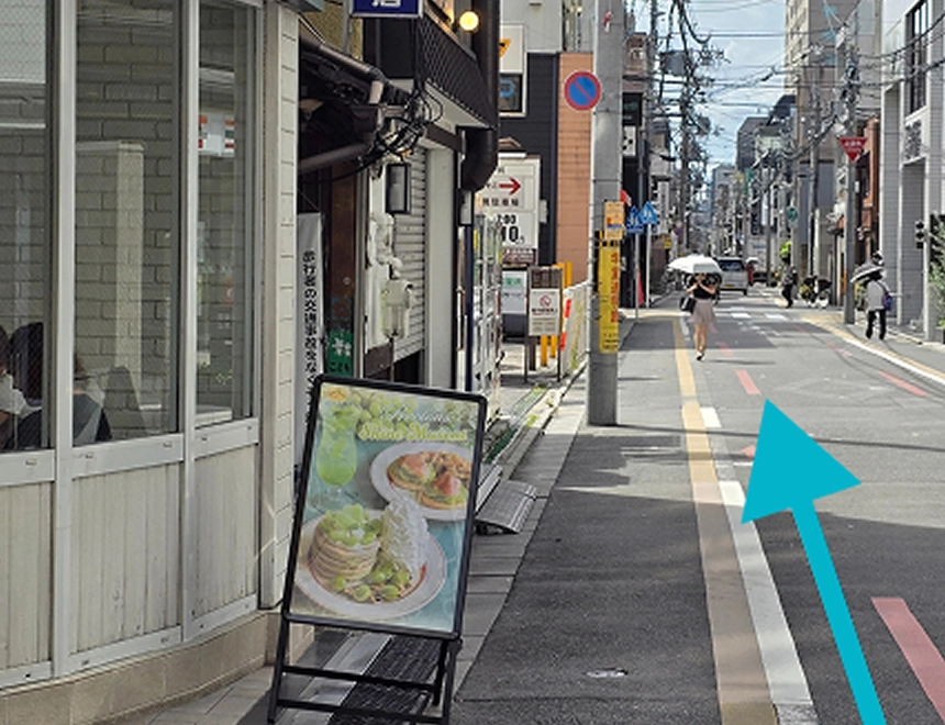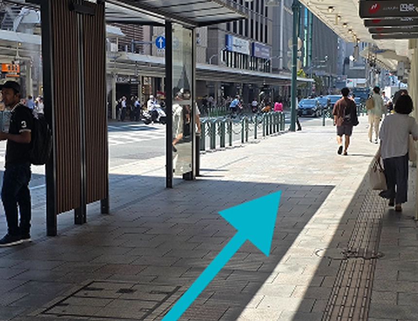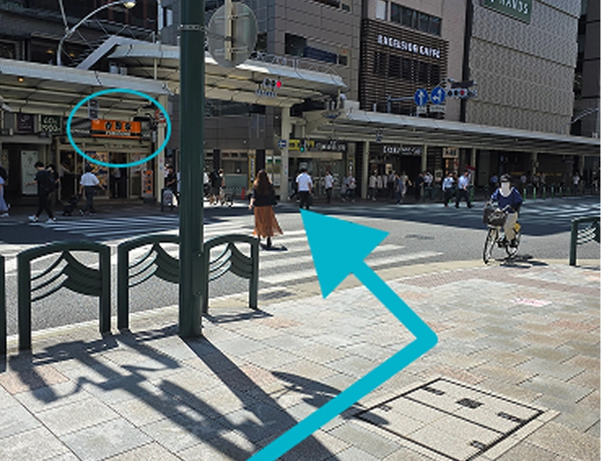 阪急京都線烏丸駅18番出口の階段を上り、地上に出てすぐ右折します。