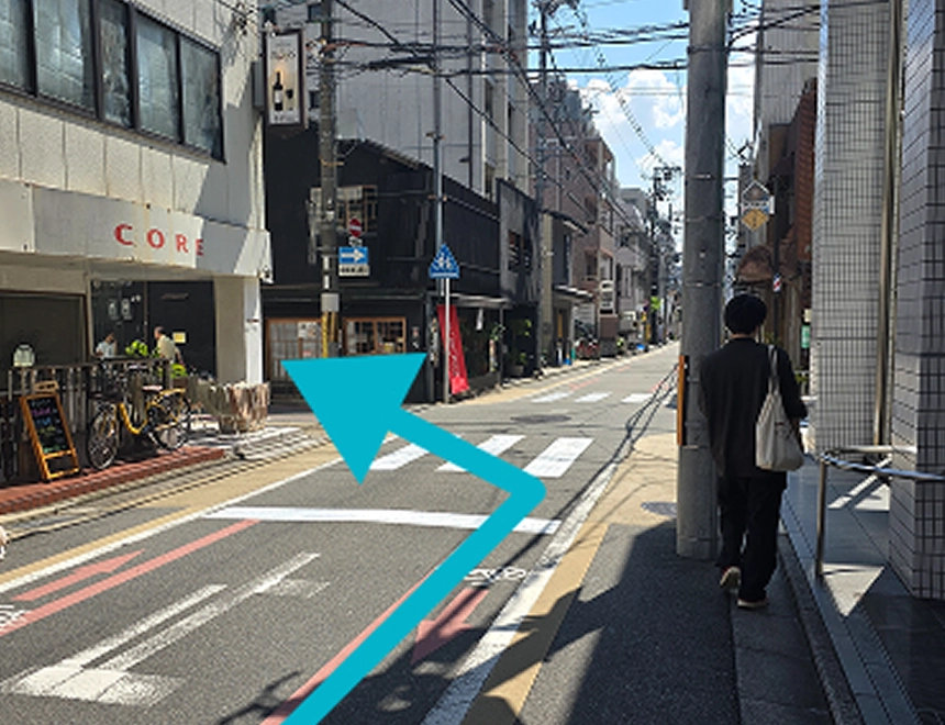 四条通挟んで角に吉野家が見えたら、横断歩道を渡ります。