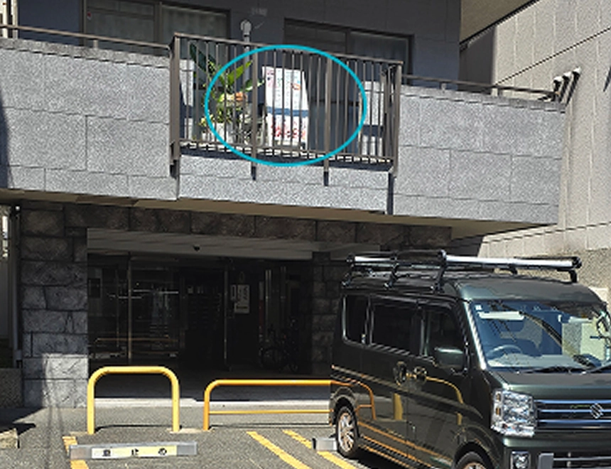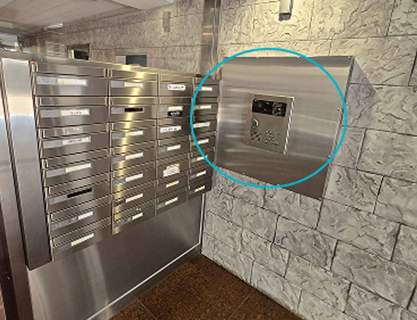 駐車場奥のエントランスを入って右手にインターホンがあります。